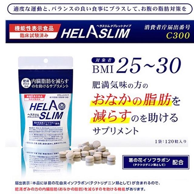 『ヘラスリム』は、葛の花由来イソフラボン(テクトリゲニン類として)を配合した内臓脂肪(お腹の脂肪)を減らすのを助けるサプリメントです。葛の花由来イソフラボン(テクトリゲニン類として)には、内臓脂肪(おなかの脂肪)を減らすのを助ける機能があります。機能性表示食品(臨床試験済み)。