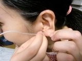 ①ハーブウォーターに浸して膨潤したフロスをピアス穴に通して掃除をす