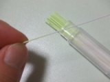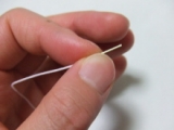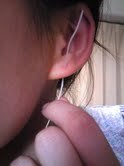 ①ハーブウォーターに浸して膨潤したフロスをピアス穴に通して掃除をす