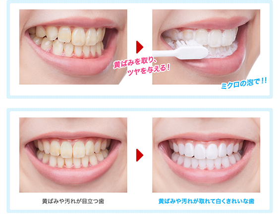 歯の汚れを落とし、きれいな白い歯に。歯を白くするだけでなく、口臭・虫歯・歯槽膿漏などの予防人も効果があり、歯の悩みをトータルケアします。
