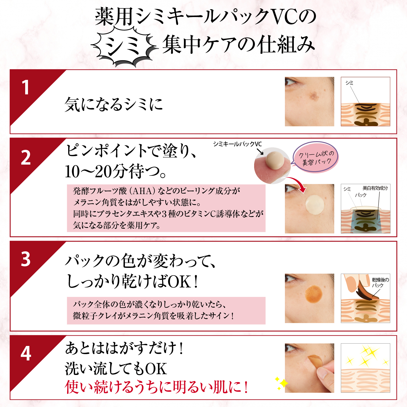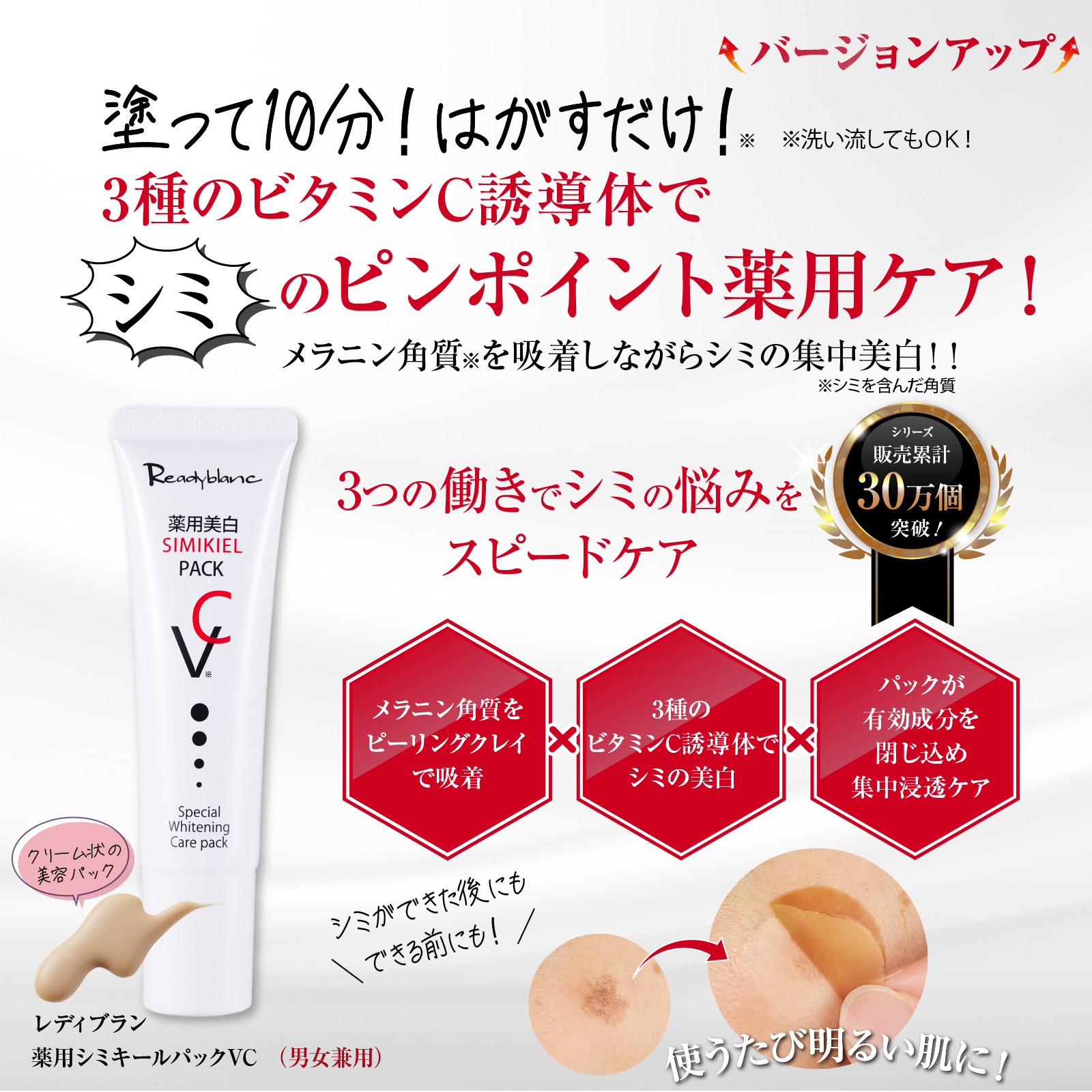 販売累計数が30万個を突破するシミのピンポイント薬用美白ケア”薬用美白シミキールパックVC”や