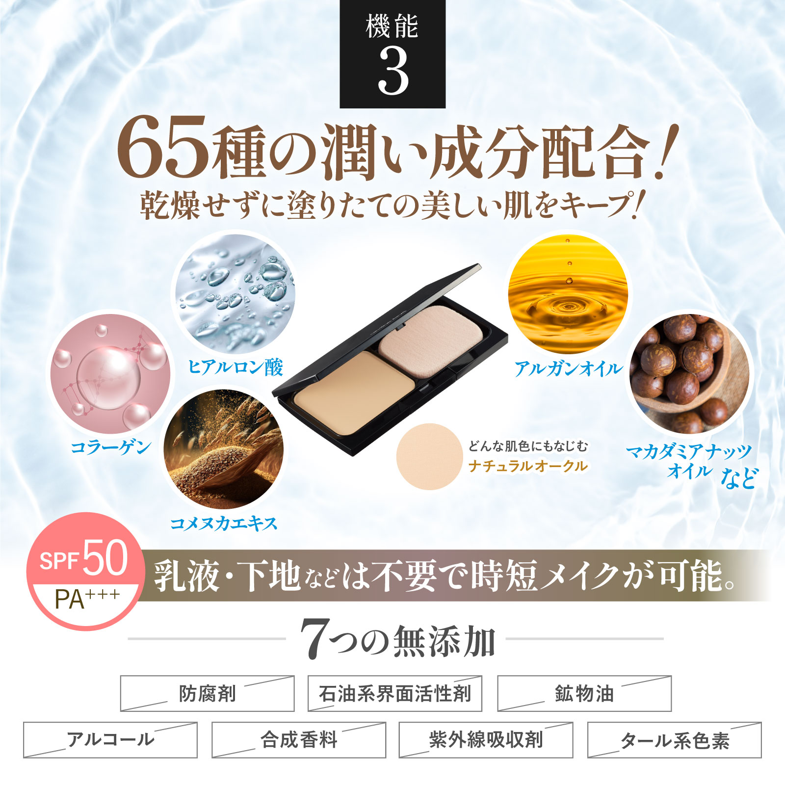 機能3:65種の潤い成分配合で、乾燥せずに塗りたての美しい肌をキープ!