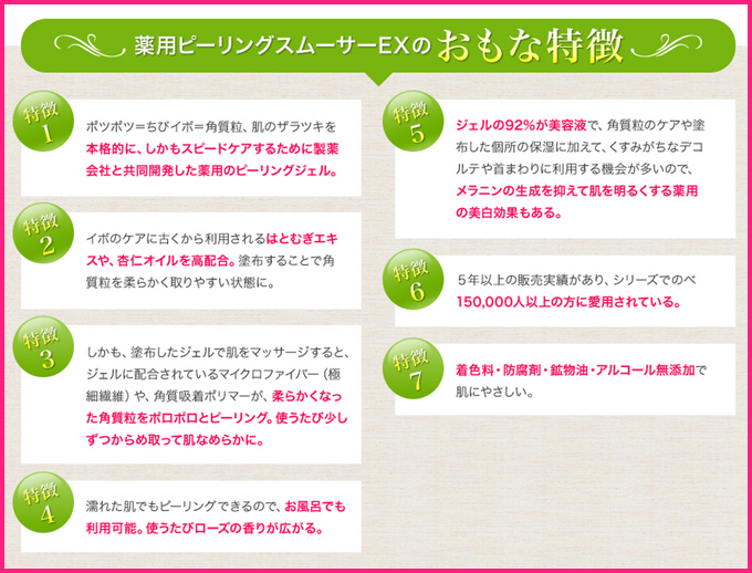 累計販売数200,000個突破!!加齢による首・胸元・頬のポツポツ(角質粒)・ザラザラの肌荒れに効果があり、製薬会社と共同開発で、肌にもやさしいことが高く評価されたピーリングゲルです!より高い効果を目指して、「はとむぎエキス」や「杏仁オイル」などの美容成分を約92%も配合しています。詳しくはコチラ