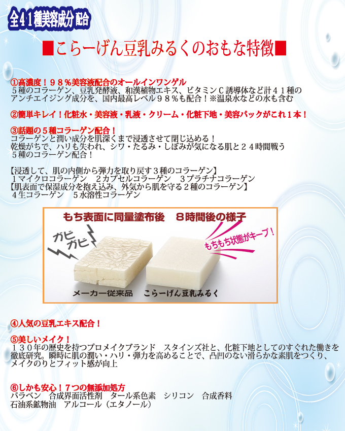 その名の通りミルクのような使用感のオールインワンゲルこらーげん豆乳みるく コラーゲン豆乳みるく【送料無料】【smtbf】【RCP】コスメジタンファンサイト参加中■5種のコラーゲン配合 浸透して肌の内側から弾力を取り戻すマイクロコラーゲン、 カプセルコラーゲン、プラチナコラーゲンに加え 肌表面で保湿… 2014/11/19