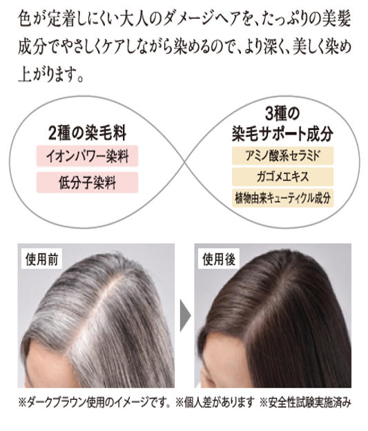 アミノ酸を豊富に含んだアミノ酸リッチローヤルゼリーエキスやブラックハニーへアバター、5種の植物由来オイルなど美髪成分を贅沢に93%配合したヘアカラートリートメント。イオンパワー染料と低分子染料に3つの染料サポート成分を加えた独自のダメージケアカラー処方で、ダメージケアしながら地肌や髪に優しく、美しく染め上げます。使うたびに深く色づき、つやのある美しい髪へと導きます。