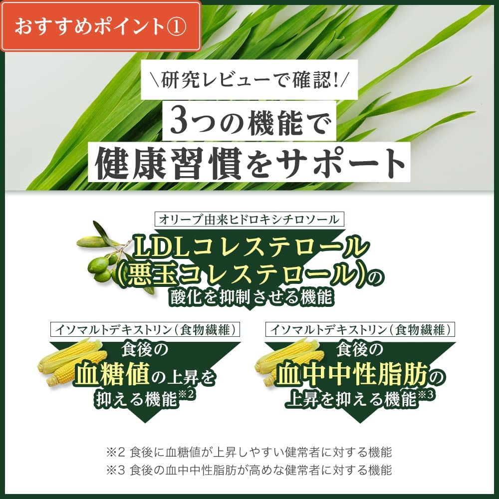 (1)【オリーブ由来ヒドロキシチロソール】抗酸化作用を持ち、血中のLDLコレステロール(悪玉コレステロール)の酸化を抑制させる機能。
