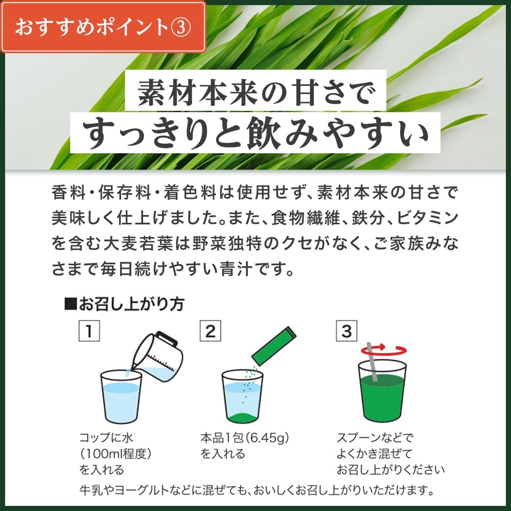 さらに、不足しがちな野菜や食物繊維も補える、甘さ控えめでスッキリとした飲み心地の青汁です。