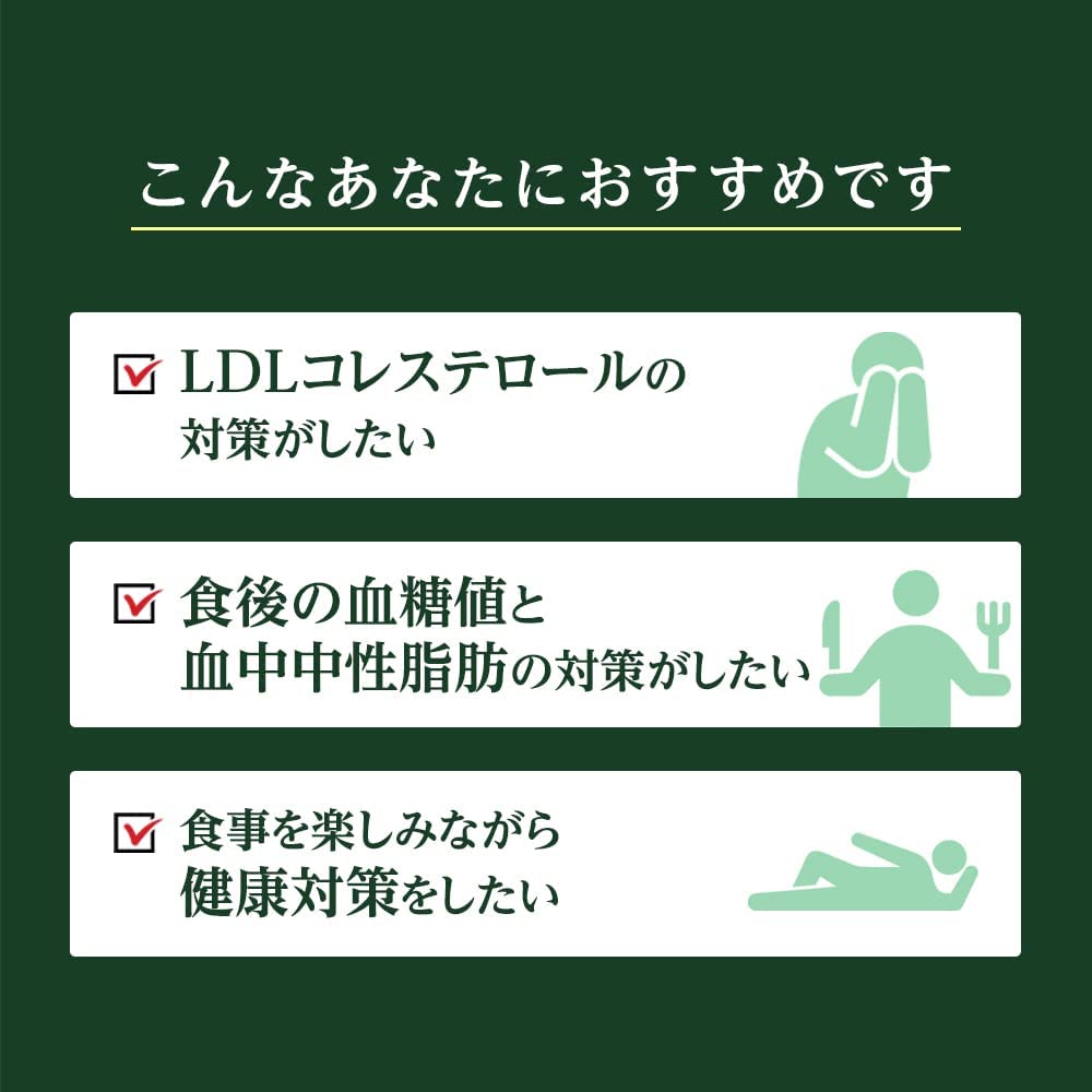本品は、LDLコレステロール(悪玉コレステロール)や食後の血糖値、血中中性脂肪が気になる方に適しています。