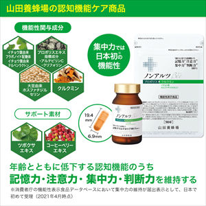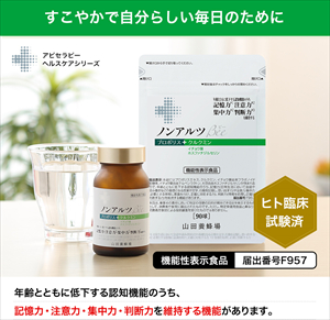 年齢とともに低下する認知機能のうち「記憶力」「注意力」「集中力」「判断力」を維持する機能性表示食品。