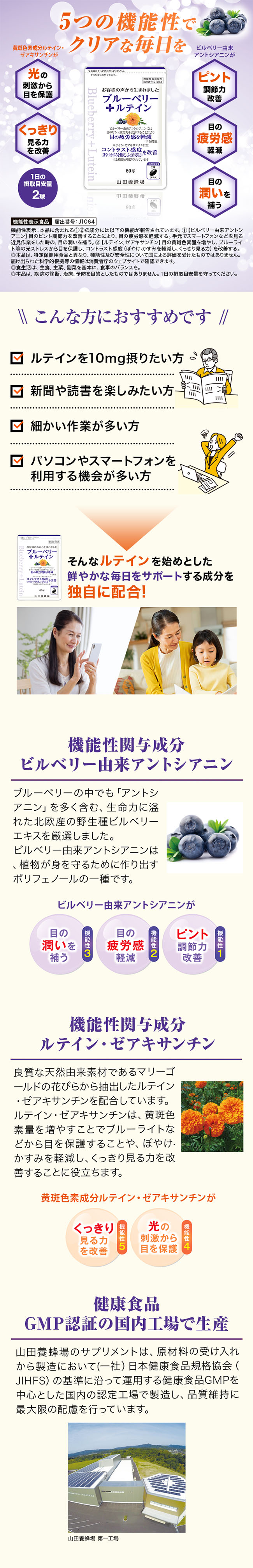 年齢とともに減少するルテインやゼアキサンチンをはじめとする、5つの有用成分を独自に配合しました。飲みやすい小粒のソフトカプセルです。クリアで潤いのある毎日をサポートします。