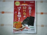 ・カンロ株式会社さんとのコラボ商品。有明海産海苔に紀州梅の粒々をはさんで焼き上げたヘルシーおやつ。梅の粒々は紀州産南高梅を100%使用しております。原料と製法にこだわった、海苔と梅の味わいをお楽しみください。