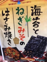 ・カンロ株式会社様とのコラボ商品。有明海産海苔に『ねぎみそ味の粒々』をはさんで焼き上げたヘルシーおやつです。