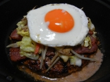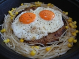 夜は、小豆島お肉の山下屋様の御厚意に甘え、お初の大魔王ハンバーグ@980円(510g)に 今回のトッピングは、半面分のグルメシュレッドチーズに、秋畜さんの特上自家製ベーコンと、もやしと、 人参と、生きくらげと、スウィートコーンの野菜炒めに、マルシンさんの奥久慈地玉子の半熟目玉焼 両面に焦げ… 2012/03/15