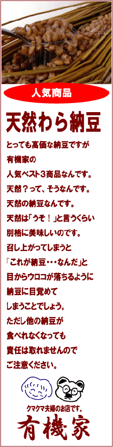 モニタープラザさんで開催中の 有機家さんのプロジェクトに参加します^^ 健康を第一に考え、体に良い食材のみを扱っている有機家さんが 今回モニタープレゼントしてくださるお品は、なぁ〜んと! 旨さ大リーグ級「天然わら納豆」 1本1600円です続きを読む >> 2009/08/01