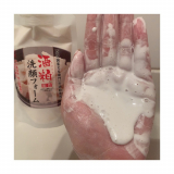酒粕と日本酒配合のしっとり泡で、もっちりうるおい肌に導きます。酒粕や日本酒に含まれるビタミンB2や豊富なアミノ酸は、肌のうるおいを保ち、肌のキメ密度を向上させる成分です。日本酒造りの職人「杜氏(とうじ)」の手が美しい理由とも言われています。お酒の香料は使用していません。精油のほのかな香りがします。