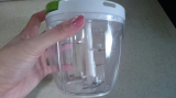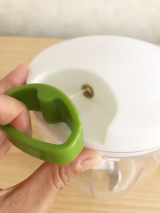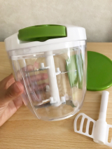 電池も電源も必要がない、手動式のみじん切り器です。 オリジナルの「ぶんぶんチョッパー・デラックス」に加え、新たにサイズアップした5枚刃の「ぶんぶんチョッパー・スーパーデラックス」の登場です。 飛散防止カバー、ホイッパー、保存用蓋のパーツが付属して、ぐっとパワーアップしました。 ぶんぶんチョッパーは、わずか数秒でみじん切りが完成します。 持ち手を手前に引っ張るだけで、玉ねぎやにんにくだけではなく、野菜の中でも硬い「にんじん」も数秒でみじん切りにできます。 食材を入れて蓋をする前に、「飛び散り防止用内蓋」を使用することで、蓋に食材が付着するのを防ぎます。 ウィスク(混ぜ器)は、たまごやクリームの攪拌に、保存用蓋は刻んだ食材の保存に使用できます。 ご注意! ※ナッツなどの固いものは使用できません。