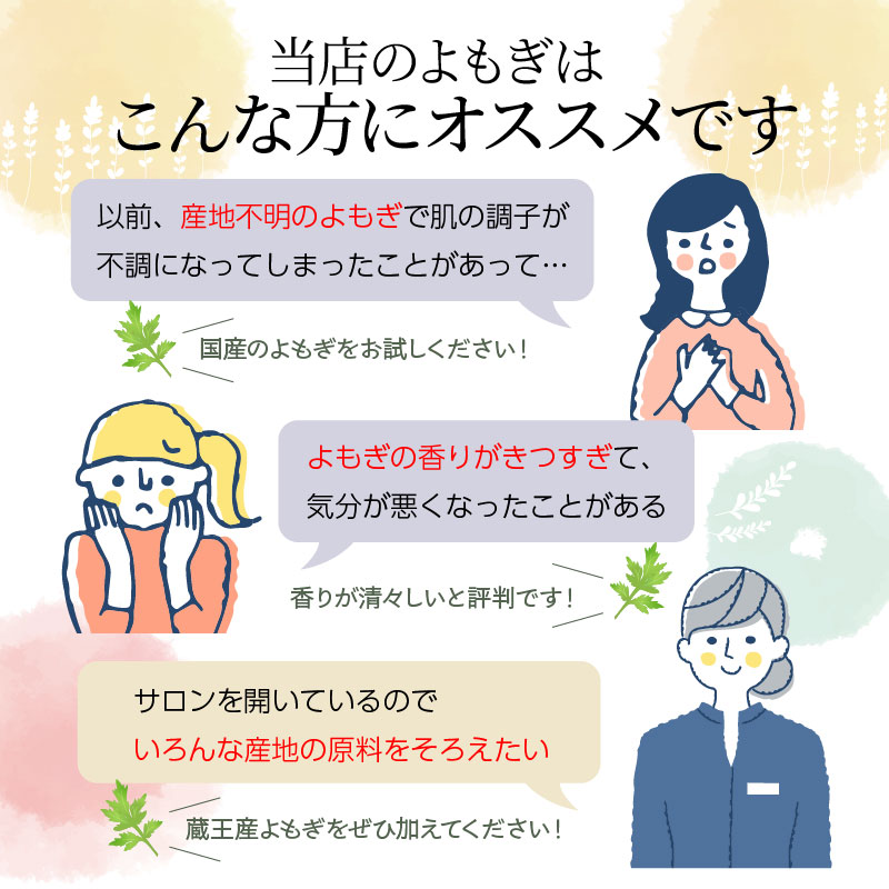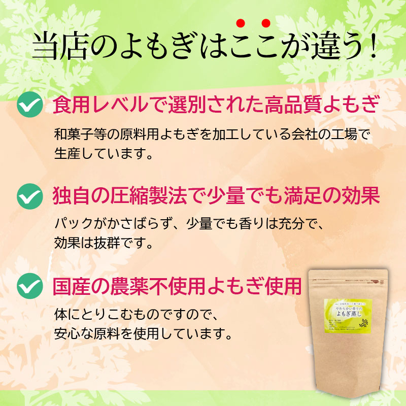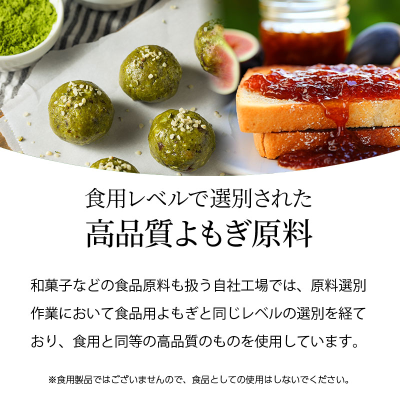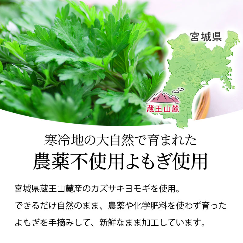 蔵王山麓で農薬不使用で、できるだけ自然のまま栽培されたよもぎを着色料や香料など使わない無添加で加工しています。入浴剤の原料としても好評の、香りと刺激が少ないよもぎです。