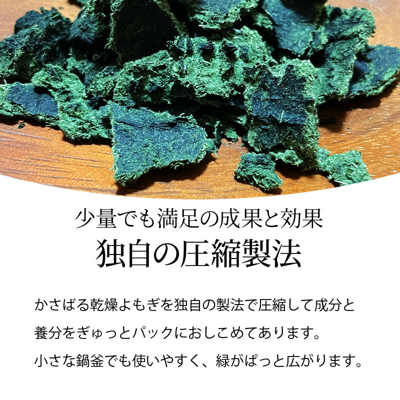 独自の圧縮製法で、乾燥よもぎの成分をぎゅっと凝縮してパッケージ。1回分が少なく見えても、鍋で煮出すと鮮やかな緑がぱっと広がります。