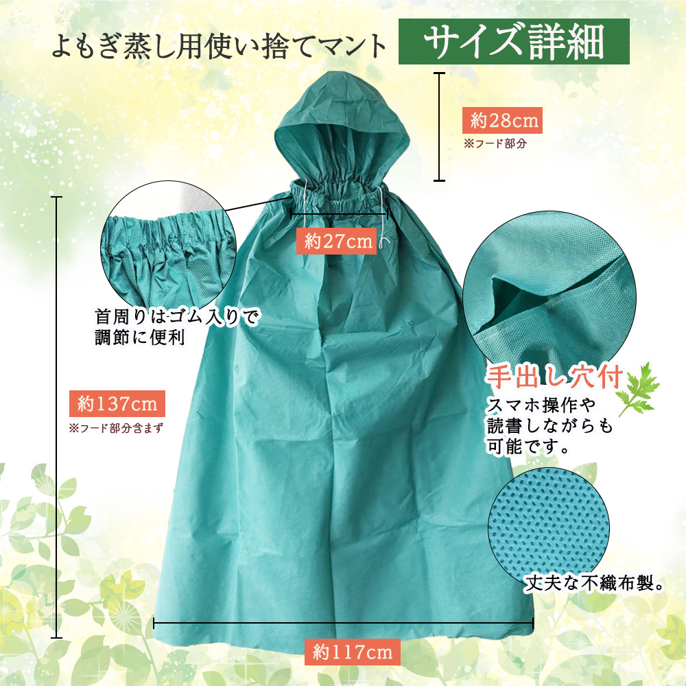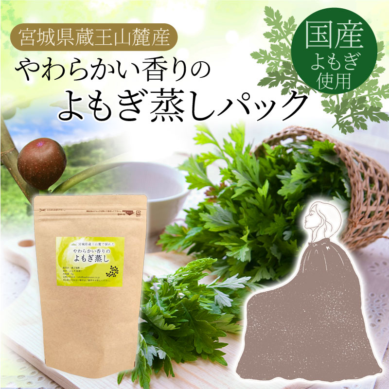 宮城県の蔵王山麓で農薬を使わず栽培されたよもぎを使用したよもぎ蒸しパックと、道具管理の手間を大幅に削減する、不織布製のよもぎ蒸し用使い捨てマントのセットです♪