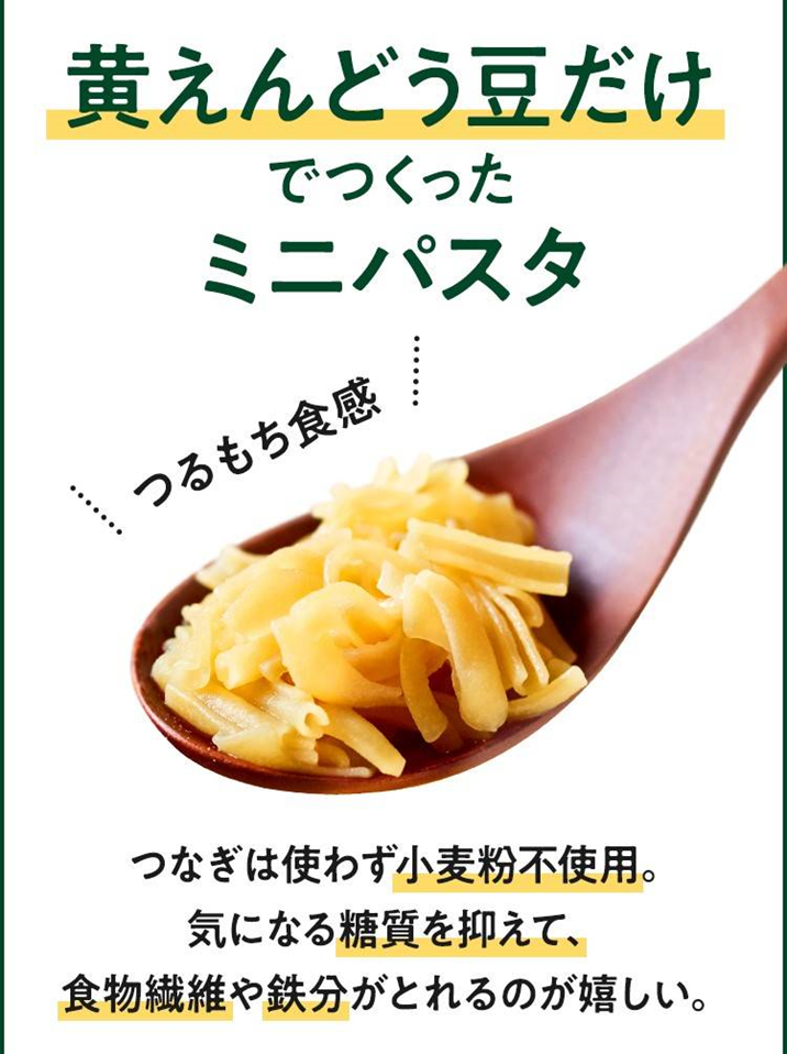 豆100%ミニパスタの豆の旨みと相性抜群のプラントベースのスープ。