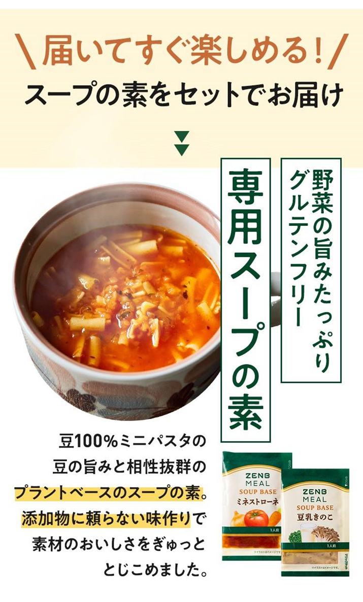 . . ---------------------------------------- 【 ZENB MEAL 】 糖質オフの食べるミニパスタスープコース6食セット ---------------------------------------- 【 豆100%のミニパスタ 】 つなぎは使わず小麦粉不使用🍝 豆の旨みがぎゅっとつまっているから シンプルな味付けでもおいしさ満足✨ 【 専用スープの素 】 豆100%ミニパスタの豆の旨みと 相性抜群のプラントベースのスープ🍲 添加物に頼らない味づくりで素材本来の味をたのしめる✨ トマトの濃厚な旨みを味わう【ミネストローネ】🍅と 豆乳ときのこの香りを楽しむ【豆乳きのこ】の2種類✨ ---------------------------------------- u0040zenb_japan #zenb #zenbmeal #ミニパスタスープ #糖質オフ #ゼンブミール #202303ZENBミール #monipla #zenb_fan . . 2023/05/31
