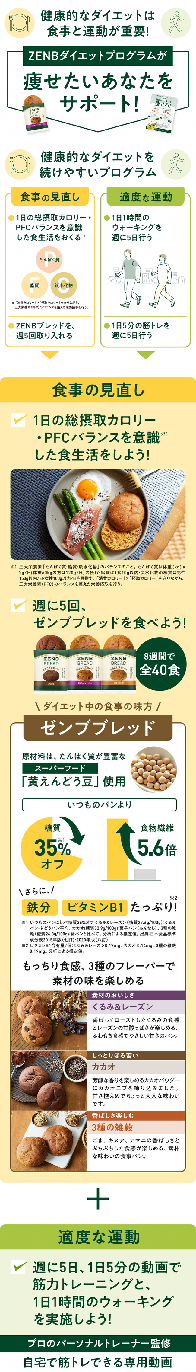 食事の見直し=1日の総摂取カロリーとPFCバランス(三大栄養素「たんぱく質・脂質・炭水化物」のバランスのこと)を意識しながら『ゼンブブレッド』を週5食取り入れる