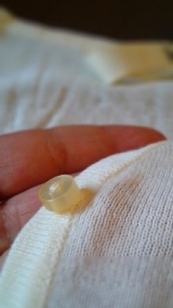 袖口、裾は幅広のリブ切り替えになっています。ツヤのある丸ボタンはそれぞれのカラーに合わせたお色になっています。